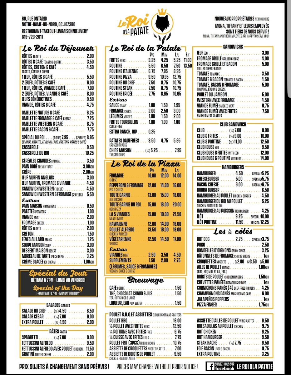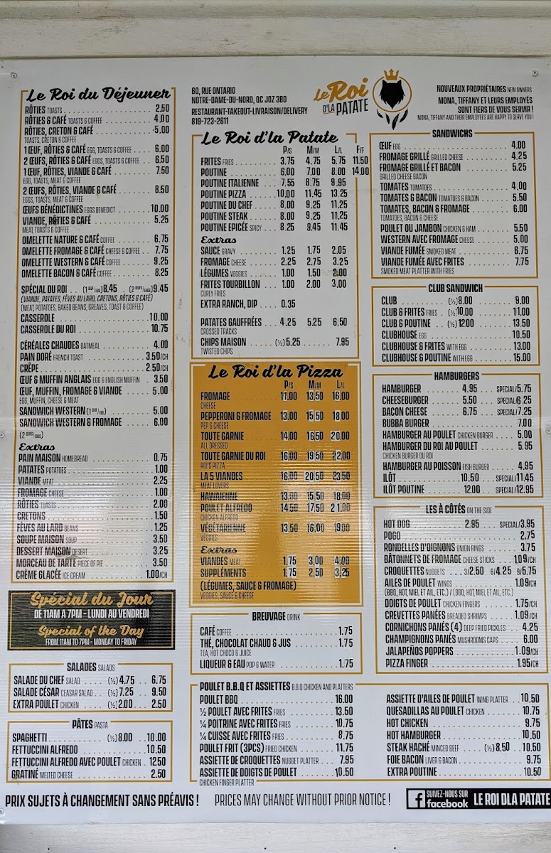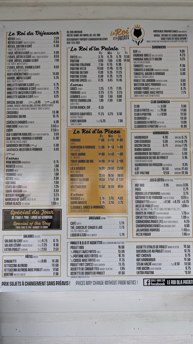 Welcome to Roi De La Patate, a hidden gem located at 60 Rue Ontario in the charming town of Notre-Dame-du-Nord, Quebec. This delightful eatery specializes in comfort food that warms the heart and pleases the palate. Roi De La Patate is renowned for its standout offerings, particularly its poutine, which has garnered rave reviews from delighted customers.