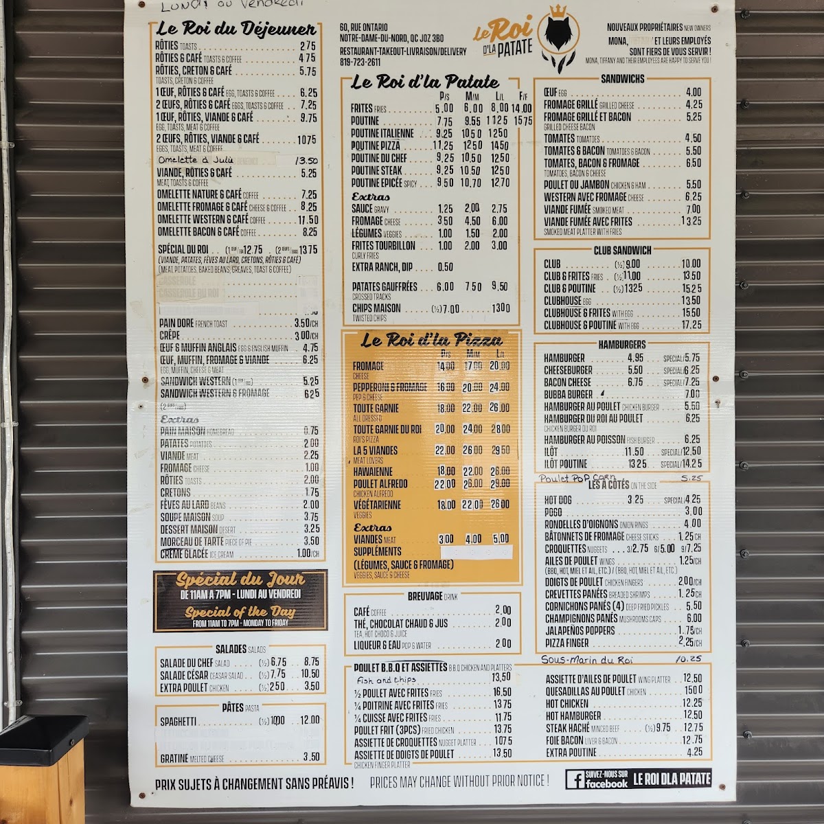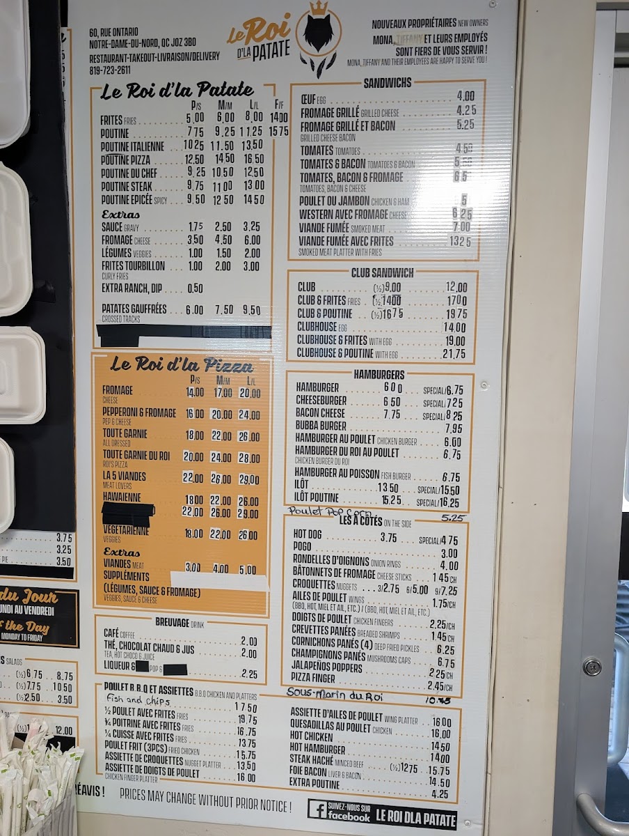 Welcome to Roi De La Patate, a delightful gem in Notre-Dame-du-Nord, QC, where poutine reigns supreme. Specializing in mouthwatering variations such as traditional, Italian, and pizza-style poutines, Roi De La Patate captures the essence of Canadian comfort food. Customers rave about the gooey texture, generous gravy, and perfectly melted curds, making each bite a nostalgic experience. Their diverse menu also features enticing grilled cheese sandwiches and flavorful extras like spiral fries and waffle potatoes. The warm ambiance and attentive service make this spot a must-visit for any food lover seeking an authentic taste of Quebec’s culinary tradition.